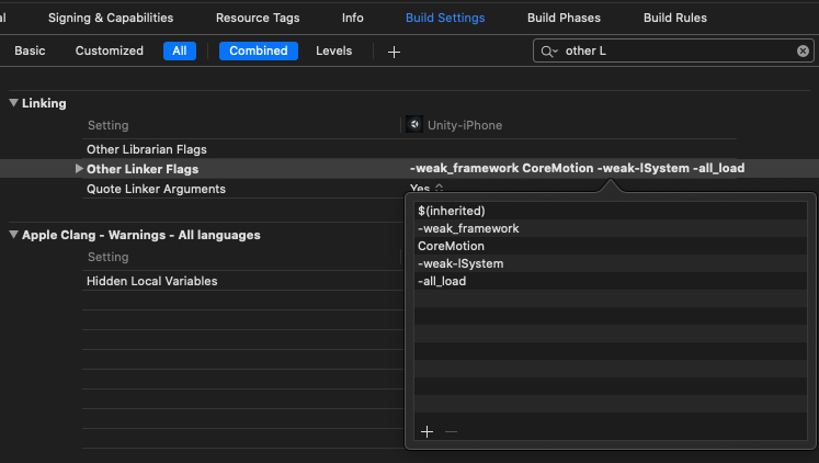1 2 3 4 5 6 7 static void AddLinkerFlag (PBXProject project ){ project.ReadFromString(File.ReadAllText(PbxProjectPath)); string buildTarget = project.TargetGuidByName(PBXProject.GetUnityTargetName()); project.AddBuildProperty(buildTarget, "OTHER_LDFLAGS" , "-all_load" ); }